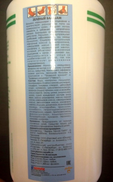 Gehwol (Геволь) Зелёный бальзам (Фусскрафт | Fusskraft grun)Нормализует потоотделение и препятствует разложению пота. Придаёт ногам свежесть и избавляет от неприятного запаха. Благодаря антисептическому действию, бальзам предупреждает грибковые заболевания и зуд между пальцами. Средство содержит натуральные эфирные масла, камфару и охлаждающий ментол, которые облегчают болезненные ощущения в ногах и снимают зуд.