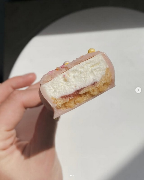 То ли пирожное, то ли мороженоеНежный внутренний мир, хрустящая основа на миндальной муке, фруктовая прослойка, шоколадная глазурь.