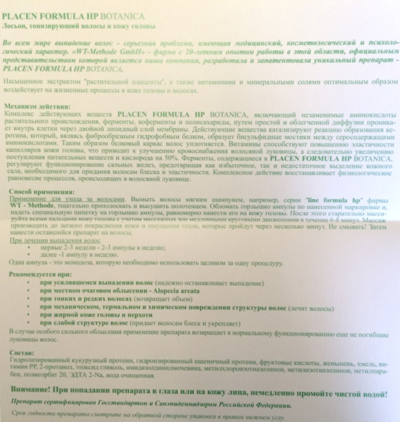 Специалисты компании «WT-Methode GmbH» рекомендуют применять препарат в случаях, когда наблюдается сильное выпадение волос или в случаях округлого облысения. Также поразительные результаты препарат может дать тем, у кого волосы тонкие и редкие и имеют слабую структуру. Кроме этого, средство оказывает положительный эффект на волосы, имеющие механическое, термальное или химическое повреждение структуры. А еще PLACENT FORMULA HP BOTANICA устраняет причины образования перхоти и возвращает луковицы волос к нормальному функционированию даже в случае сильного облысения.